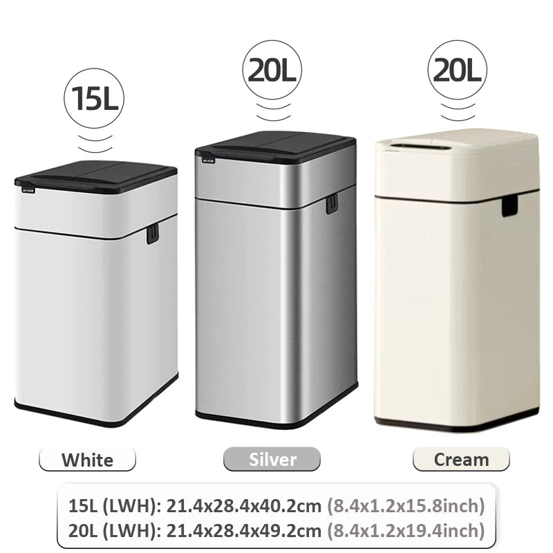 Automatischer Mülleimer aus Edelstahl mit Sensor – 15–20L Fassungsvermögen, geruchsdicht und perfekt für Küche oder Bad.